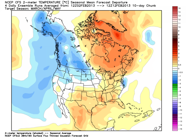 The spring is forecast to see normal to above normal temperatures  It looks to continue wet in the west and central Gulf to the lower Tennessee Valley. This implies, late winter, early spring severe weather although not as extensive as 2011.
