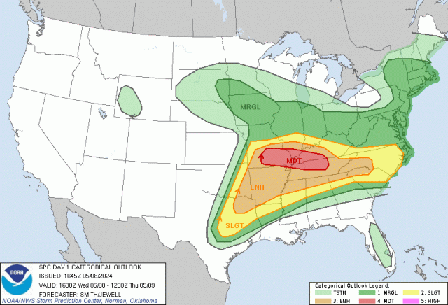 the I-65 corridor. Severe weather is possible, particularly from Huntsville westward. Storms will be in a weakening stage as they reach NE Alabama. The primary severe weather threat is damaging wind gusts of 60-70mph, but an isolated tornado threat will exist as well, particularly as the storms arrive in NW Alabama. Lows tonight will drop into the mid 50s. The chance for rain is 100%.